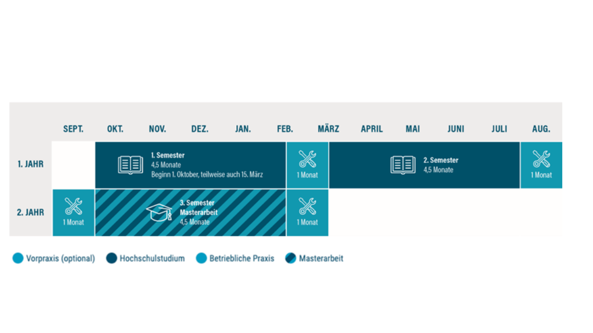 Die Regelstudienzeit beträgt 1,5 Jahre in Vollzeit bzw. 3 Jahre in Teilzeit. (inkl. Masterarbeit)