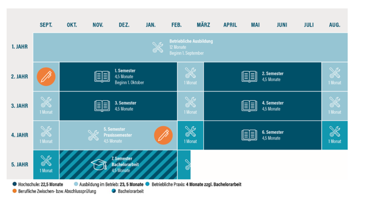Die gesamte Ausbildungszeit (Berufsausbildung und Studium) beträgt 4,5 Jahre.