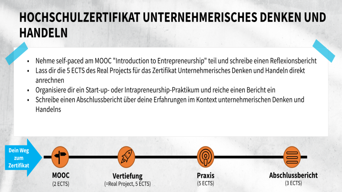 Das Zertifikat setzt sich aus drei Pflichtmodulen (Grundlagen Entrepreneurship (MOOC), Praxis & Abschlussbericht) sowie einem Wahlpflichtmodul (siehe Modulkatalog) zusammen.