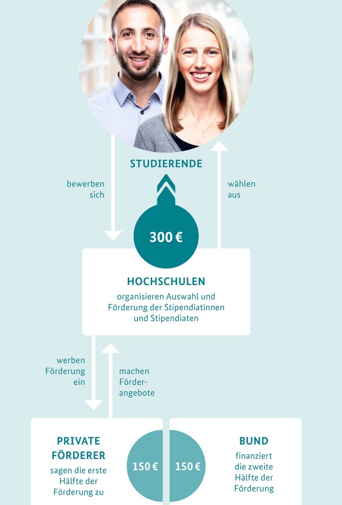 Die Höhe des Förderbeitrags beträgt je Stipendium und Förderjahr 1.800 €. Das heißt, dass die Stipendiat/-innen pro Monat 300 € erhalten – 150 € von Ihnen, 150 € vom Bund.